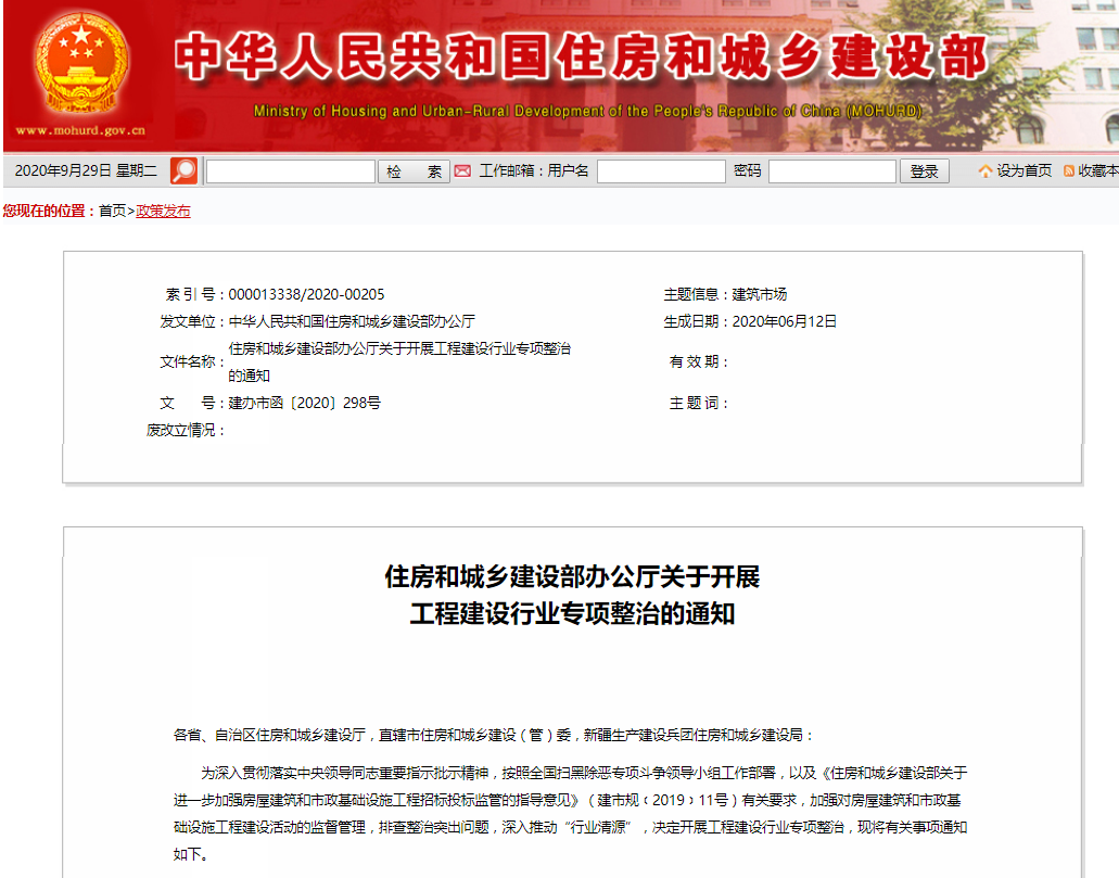 2020年6月12日,住房和城乡建设部办公厅印发《关于开展工程建设行业专项整治的通知》,加强对房屋建筑和市政基础设施工程建设活动的监督管理,排查整治突出问题,深入推动“行业清源”,开展工程建设行业专项整治。