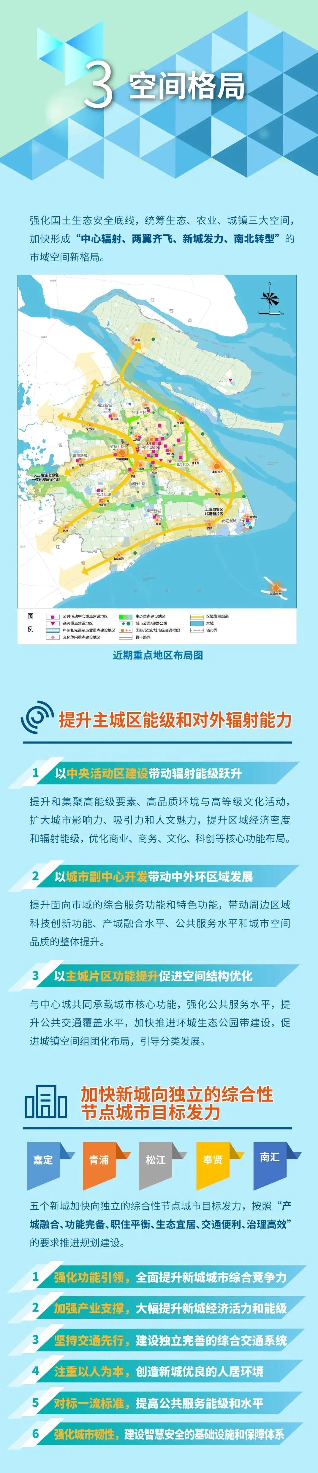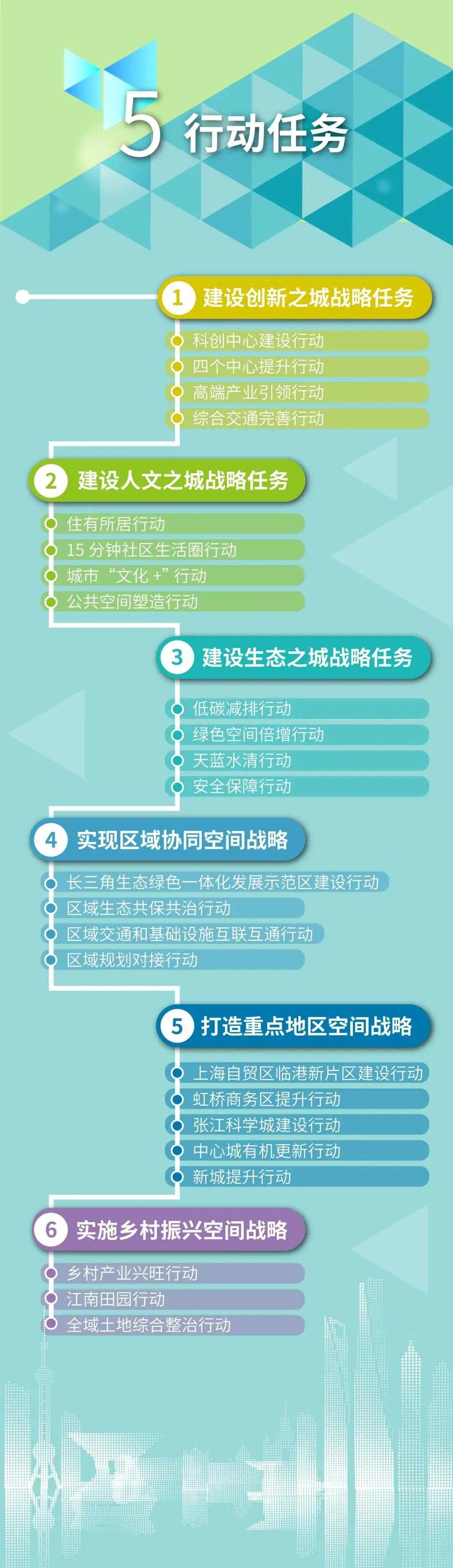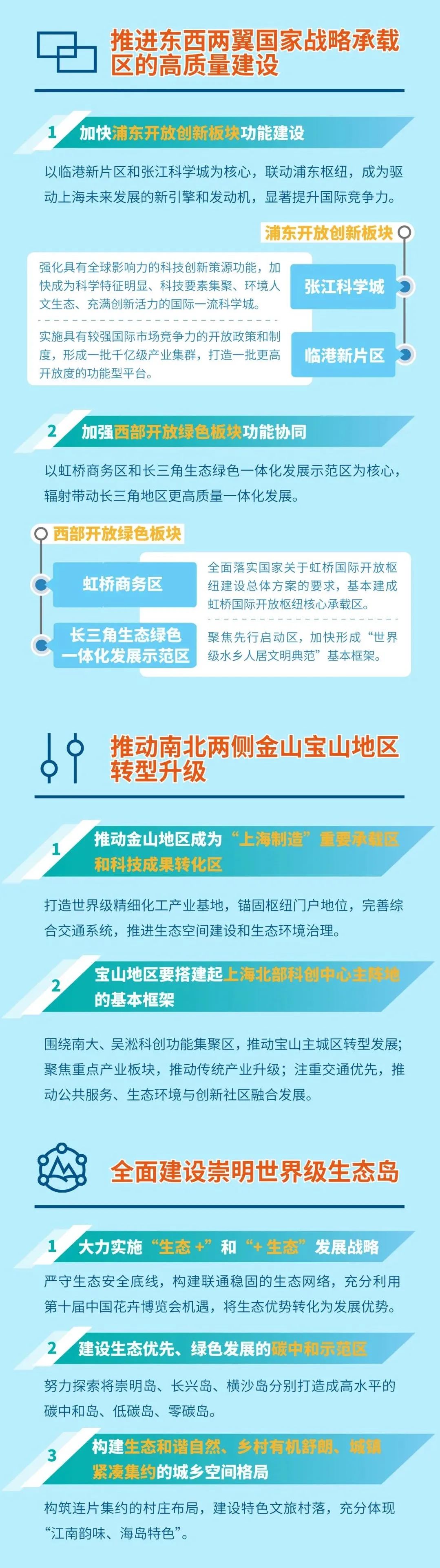一是提升主城区能级和对外辐射能力;二是加快新城向独立的综合性节点城市目标发力;三是推进东西两翼国家战略承载区的高质量建设;四是推动南北两侧金山宝山地区转型升级;五是全面建设崇明世界级生态岛。